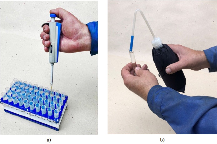 Исследования выполнены в 2021 и 2022 гг. в лаборатории севооборотов и адаптивных агротехнологий ФГБНУ «Курский ФАНЦ». Для достижения цели исследований предложен инновационный способ, исключающий необходимость в многочисленных промежуточных пробирках с операциями их заполнения (рис. 2a) [30].