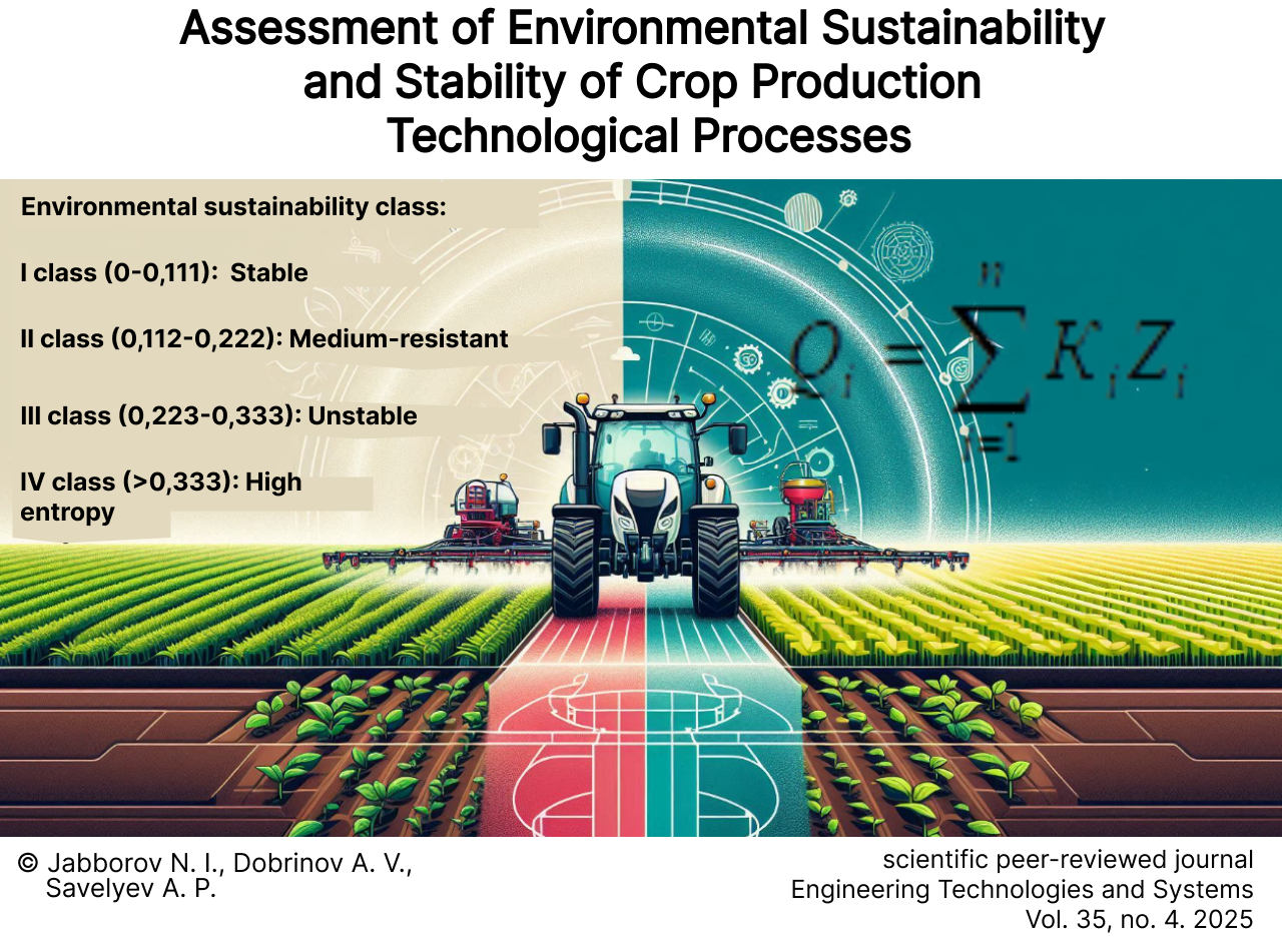 Results. There have been developed partial and integral criteria for assessing environmental sustainability and stability of crop production technological processes. There are given the examples of criteria calculation and the assessment of environmental sustainability and stability of the technological processes of transportation and application of liquid organic fertilizers to the soil. There has been substantiated the scale of assessment of technological processes based on the values of the integral evaluation criterion. According to the environmental sustainability degree, the authors propose to divide technological processes into stable, medium-stable, unstable and with high entropy.