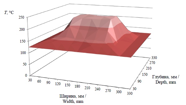 На рисунке 3 показано распределение температурного поля при потреблении 1 440 Вт, отклонение от заданного интервала ±10 °С на площади 600 см².