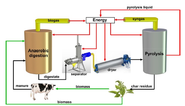 – AD-Py. Anaerobic digestate is used for pyrolysis as a valuable feedstock material for energy and biochar production;