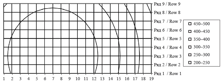 При исходных данных осевая сила света составила I0 = 2 873 кд, максимальная освещенность Emax = 499 лк, минимальная освещенность Emin = 290 лк, средние освещенности Eср1 = 394 лк и Eср2 = 429 лк. Значения коэффициентов, характеризующих неравномерность освещения: z1 = 1,72; z21 = 1,36; z22 = 1,48 отн.ед.