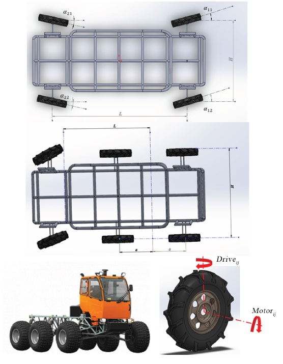 В качестве модели шасси используется универсальная параметрическая CAD/CAE-модель (SolidWorks), разработанная авторами. Она легко адаптируется для разных проектных решений «Пегас-Агро» и предусматривает следующие виды компоновки: двухосевую и трехосевую, заднеприводную, переднеприводную и полноприводную. Модель оснащена одноосевым, двухосевым и дифференциальным управлением с учетом угла Аккермана [9; 24].