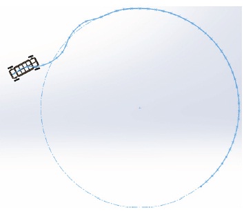 На рисунке 3 показаны результаты численного эксперимента при λ = 1, X0 = (10, 20) м, заданном радиусе окружности R = 12 м. Результаты демонстрируются для некоторого произвольного начального положения робота, параметры которого считываются с виртуальных сенсоров. Видеоролик демонстрирует процесс движения5.