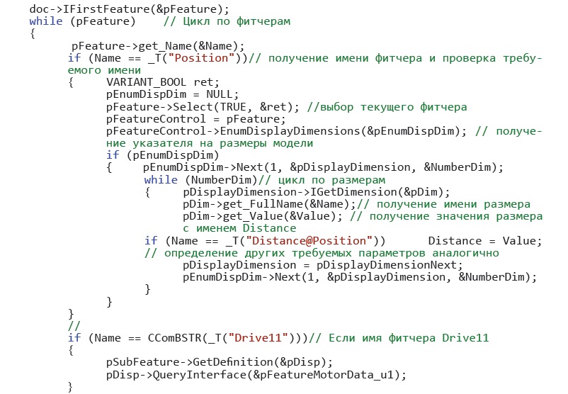 На рисунке 7 показан фрагмент программного кода, реализующего доступ к фитчерам модели, в частности, к эскизу с именем Position и мотору в дереве моделирования с именем Drive11 (в наших обозначениях Driveij i = 1, j = 1), а также чтение (импорт) значения размера с именем Distance. В наших обозначениях этому параметру соответствует фазовая переменная z1 = ||CA|| (рис. 4).