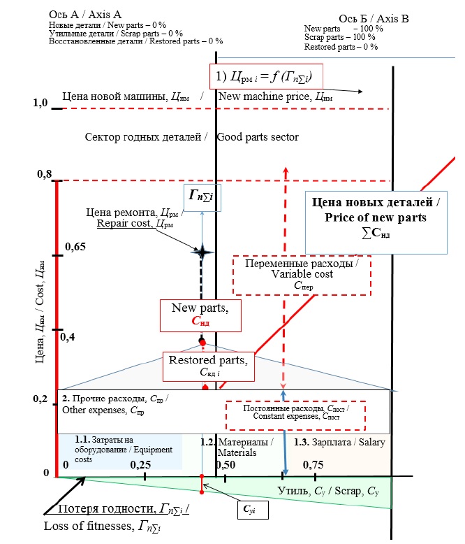 Результаты исследования. Полученные результаты показали, что цена ремонта машины зависит от уровня потери годности ее деталей, которые были разделены на три группы: годные без ремонта, годные после восстановления и утильные, которые не подлежат восстановлению. Были построены зависимости цены капитального ремонта машины и дохода от реализации компонентов утилизируемой машины при различной потере годности, которые позволили определить границы дальнейшего использования машины, достигшей предельного состояния.