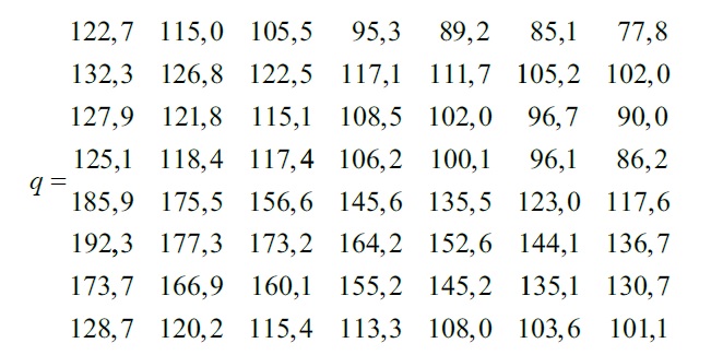 Номинальное значение пусковой цикловой подачи насоса Uном = 140 мм3/цикл. Предельное значение пусковой цикловой подачи насоса Uпр = 110 мм3/цикл. Время испытаний ti = (0, 4, 8, 12, 16, 20, 24), стендо-час. Коэффициент ускорения испытаний Ku = 100. Результаты таких испытаний для насоса УТН-5 приведены в виде массива q (8 x 7) на рисунке 3.