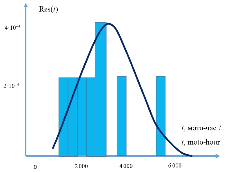 График гистограммы и закона распределения ресурса приведен ниже, на рисунке 6. Здесь Тср = 2 322 мото-часов, среднее квадратическое отклонение ресурса σ = 840 мото-часов.