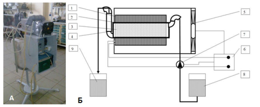 7 – peristaltic pump; 8 – initial product tank; 9 – processed product tank
