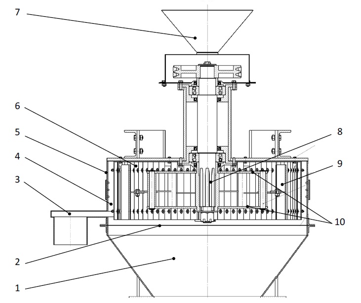 7 – загрузочный бункер; 8 – ротор; 9 – лопасть; 10 – диск ротора