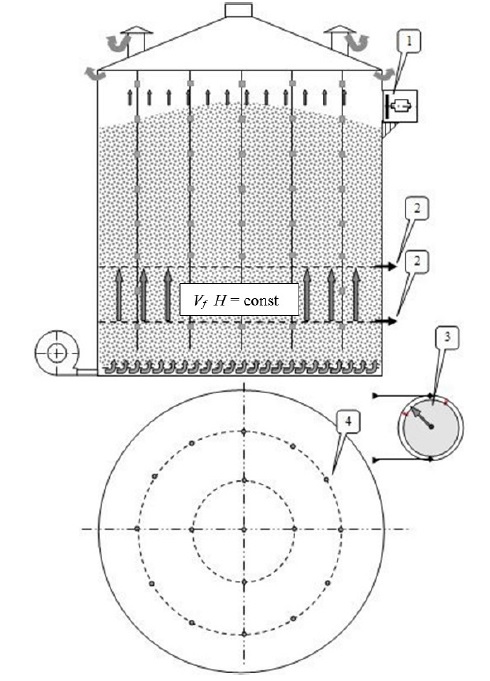 Коэффициенты в таблице 1 получены В. Ф. Самочетовым экспериментально при скоростях фильтрации свыше 0,1 м/с. Фактические скорости фильтрации в металлических силосах, по данным О. М. Бинело, не превышают 0,05 м/с [8]. Требуется экспериментально подтвердить правомерность использования значений эмпирических коэффициентов для этих режимов вентилирования. В ряде работ формула (1) применена для мониторинга количества воздуха, нагнетаемого в зерновую массу [8; 9]. Предлагается измерять перепад давления в слое фиксированной толщиной внутри зерновой насыпи. По формуле (1) вычисляют среднюю скорость фильтрации, затем средний расход воздуха через массу зерна и удельную подачу. Технологическая схема хранения зерна в металлическом силосе с мониторингом расхода воздуха представлена на рисунке 1.