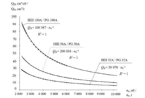 Поворотом рукоятки дросселя стенда устанавливается номинальное для испытуемого насоса давление. Обнулив счетчик циклов, рукоятку трехходового крана поворачивают в положение «включено». Выбрав начало отсчета на шкале счетчика жидкости, включают счетчик циклов, по которому фиксируется контрольный объем масла: для гидронасосов марки НШ 32А – 60 л; для НШ 50А – 100 л; для НШ 100А – 200 л. Выключив счетчик импульсов, по зависимости, представленной на рисунке 3, определяют действительную подачу насоса Qд отдельно для каждой модели.