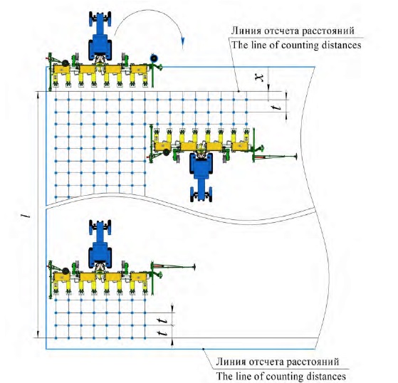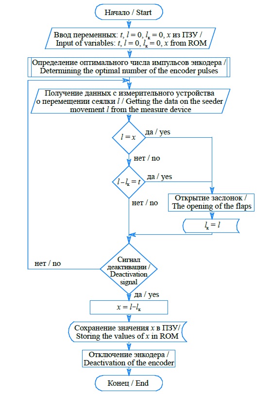 Далее сеялка совершает разворот и начинает второй проход. При этом производится активация энкодера измерительного устройства и обнуление переменных l и lк. При перемещении сеялки на расстояние x программа управления подает сигнал на открытие заслонок и высев семян в борозду [21]. Последующие открытия заслонок осуществляются через расстояние шага t в соответствии с алгоритмом программы управления (рис. 4).