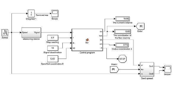 На вход блока Control Program при помощи блоков, моделирующих постоянный сигнал, задаются следующие параметры: шаг посева t, расстояние x первого открытия заслонок для высева семян и значение расстояния отключения энкодера. Расстояние х в начале первого прохода сеялки устанавливается равным 0. Блок Signal Deactivation, определяющий расстояние отключения измерительного устройства, моделирует достижение сеялкой координат линии отсчета расстояний в конце прохода и тем самым определяет длину поля.
