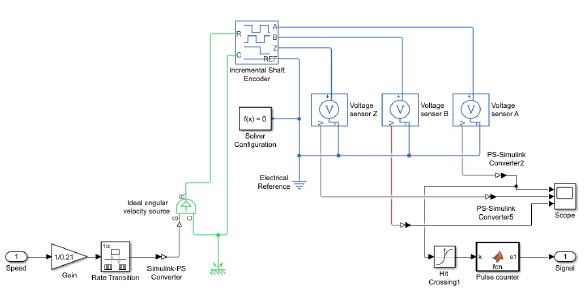Так как длительность импульсов энкодера непостоянна и зависит от заданного количества импульсов n, это приводит к тому, что в течение нескольких тактов счета модели на блоке Pulse Counter будет удерживаться ненулевой сигнал энкодера, что приведет к погрешностям в подсчете импульсов. Поэтому возникает необходимость в преобразовании импульсов энкодера в единичные сигналы, которые не будут зависеть от количества импульсов n. Для этого используется блок Hit Crossing, который выдает единичный импульс, когда входной сигнал превысит задаваемое значение в направлении увеличения сигнала.