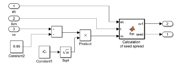 Блок Calculation of Seed Spread вычисляет абсолютное положение семян в борозде lс с учетом выражения (9), местоположения сеялки на момент открытия заслонок посевных секций и текущего значения скорости. Для этого на вход блока Calculation of Seed Spread подаются с выходных портов ek и lkm блока Microcontroller сигналы управления открытием заслонок и расчетное расстояние открытия заслонок lkm сеялки. При положительном значении сигнала, приходящего с порта ek, фиксируется значение lkm, которое затем используется в вычислении lс по формуле: