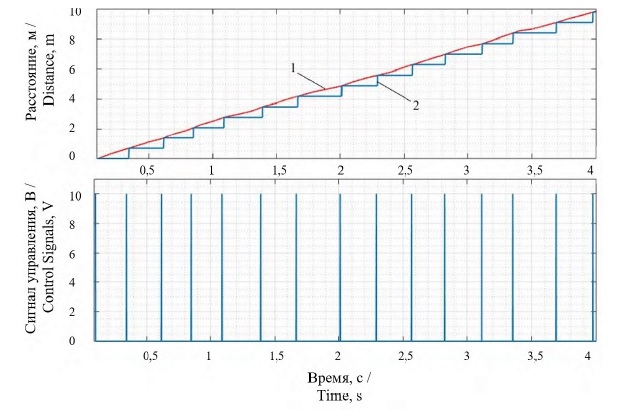 Как видно из совмещенных графиков, алгоритм управления исполнительными механизмами работает адекватно. Сигналы управления открытием заслонок генерируются на каждом шаге посева t без пропусков. Различие интервалов между сигналами управления на графиках (рис. 8) обусловлено регистрацией сигналов по времени. При этом сигнал управления подается в зависимости от пройденного пути, который переменен во времени.