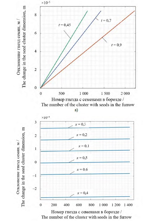 В результате численных экспериментов определено, что величина максимального отклонения последнего гнезда семян не превышает 2,7 мм на 1 000 м (при x = 0,3 м и t = 0,7 м) при различных вариантах позиции начального открытия заслонок, что незначительно, по сравнению с агротехническими показателями, и достаточно для проведения квадратно-гнездового посева.