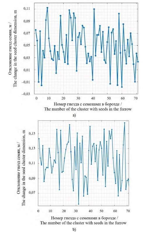 Установлено, что точность распределения гнезд семян на поле определяется в большей степени скоростью сеялки, чем настройками измерительного устройства, так как отклонение гнезд семян под влиянием скорости посевного агрегата (х = 0,078 ‒ 0,243 м при v = 2,5 м/с) на порядок превышает отклонения (ΔL = 2,7 ∙ 10–3 м при x = 0,3 м, v = 2,5 м/с), определяемые настройками энкодера путеизмерительного колеса и алгоритмом управления. Поэтому возникает необходимость в снижении скорости сеялки для уменьшения разброса семян в борозде. Но это ведет к нивелированию достоинств квадратно-гнездового размещения семян и необходимости поиска способа повышения качества работы заделывающих органов сеялки для снижения разброса и фиксации семян в борозде на высоких скоростях посева.