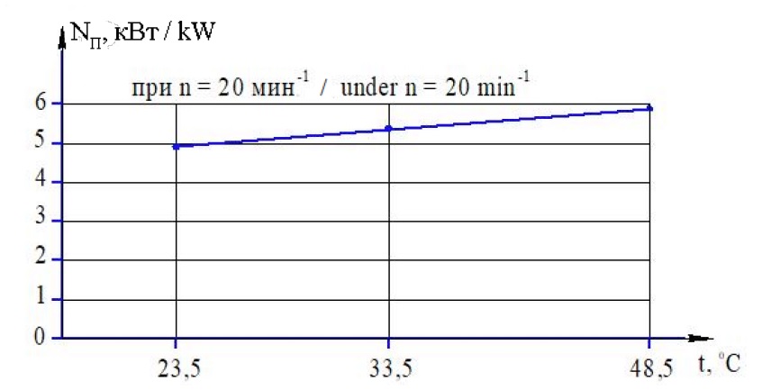 В результате обработки и анализа экспериментальных данных установлена зависимость изменения потребной мощности установки для очистки картофеля аэродинамическим способом от температуры воздуха на выходе из форсунки. В качестве примера на рис. 2 представлена графическая зависимость потребной мощности экспериментальной установки от температуры воздуха на выходе из форсунки при постоянной частоте вращения барабана n = 20 min‒1.