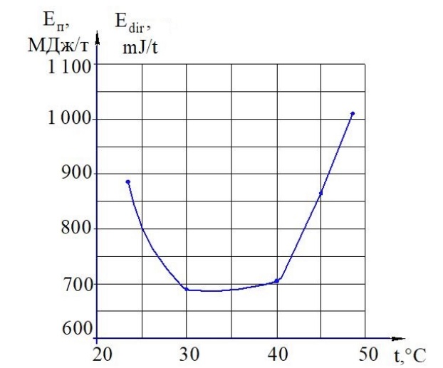 Графическая зависимость энергозатрат EП (МДж/т), выраженных расходом электрической энергии, от температуры воздуха на выходе из форсунки представлена на рис. 3.