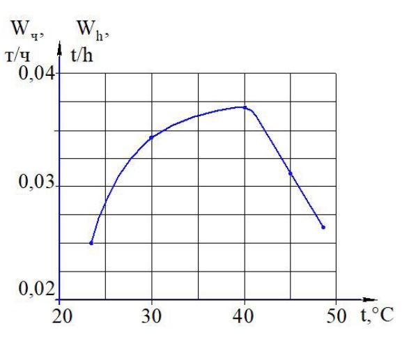 Графическая зависимость часовой производительности экспериментальной установки Wч (т/ч) от температуры воздуха t на выходе из форсунки показана на рис. 4.