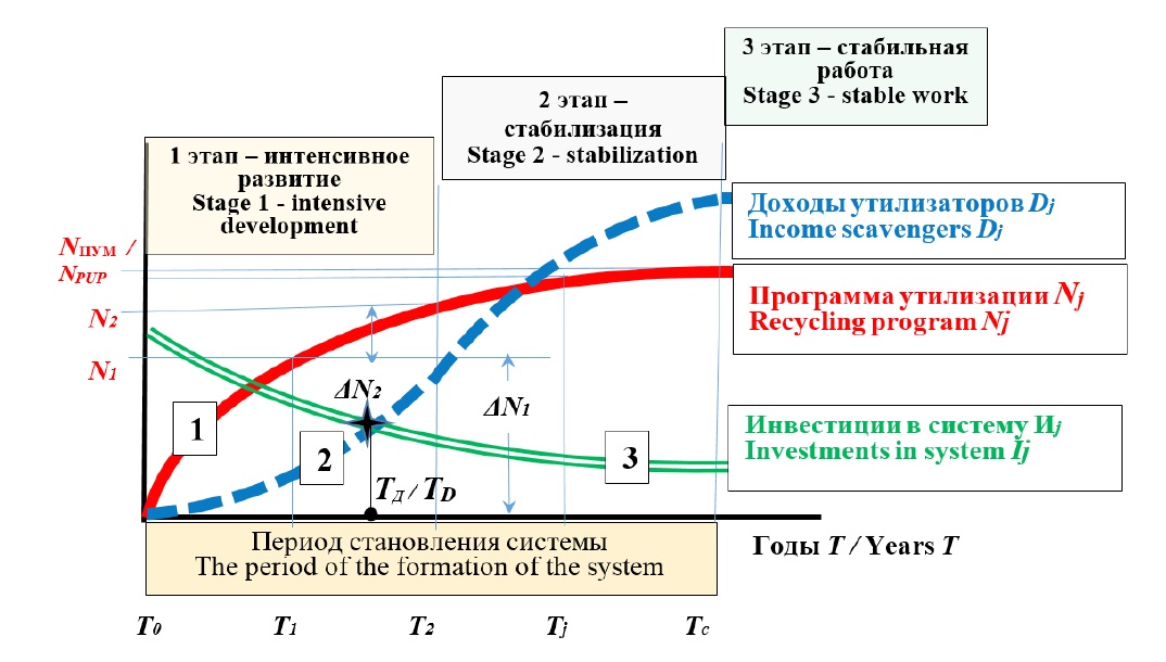 Наиболее сложным является этап интенсивного развития, который характеризуется созданием инфраструктуры, обеспечением ее технологическим оборудованием и технологической документацией, доработкой законодательной базы и выполнением других работ, требующих затрат. При постепенном увеличении программы утилизации каждый j-й год от N0 = 0 до проектной мощности NTc = NПУМ ежегодные инвестиции на этапе стабилизации системы будут уменьшаться, а утилизационные предприятия с момента Тс, когда система выйдет на проектную мощность NПУМ, начнут получать стабильные доходы, превышающие инвестиции. В период стабильной работы инвестиции на проведение утилизационных работ будут минимальными. Именно этот период формирования системы рассматривается в докладе29 и других зарубежных работах.