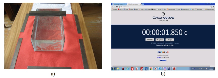 Геометрические параметры прозрачного стеклянного сосуда, высоту hп1 столба воды или водного раствора соли между метками, а также высоту h сбрасывания зерновок в воду или в водный раствор соли измеряли при помощи линейки с миллиметровым делением. Время tп движения зерновки в воде или водном растворе соли между метками определяли при помощи компьютерного секундомера; оно отображалось на экране до тысячных долей секунды. Процесс движения зерновки в жидкости и показания секундомера фиксировались с помощью видеосъемки телефоном OnePlus 3T с частотой 120 кадров в секунду и просматривались покадрово. В результате время падения зерновки между метками столба жидкости определялось с точностью до 0,02 с с учетом фиксации двух кадров, соответствующих касанию зерновкой двух меток.