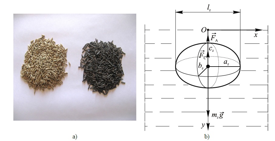 Materials and Methods. The immersion of separately taken rye grains in water (ρzh = 1,0 ∙ 103 kg/m3) and aqueous solutions of sodium chloride (NaCl) with density ρzh = 1,09 ∙ 103 kg/m3 and ρzh = 1,15 ∙ 103 kg/m3. The ellipsoid is taken as the geometric model of the grains. Theoretical studies were performed for the grain density ρz from 1.2 ∙103 kg/m3 to 1.5 ∙ 103 kg/m3, lengths lz from 5.0 · 10–3 m to 10.0·10–3 m, widths b from 1.4 · 10–3 m to 3.6 · 10–3 m and thickness δ from 1.2 · 10–3 m to 3.5 · 10–3 m based on the methods of mathematical modelling using the laws of hydrodynamics.