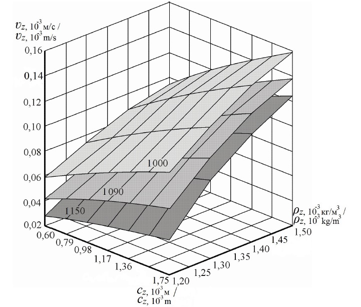 Соответствующие формуле (14) зависимости скорости ʋz погружения эллипсоидальной зерновки в жидкость плотностью 1,0 ∙ 103 кг/м3, 1,09 ∙ 103 кг/м3 и ρzh = 1,15 ∙ 103 кг/м3 от величины малой полуоси cz и плотности ρz зерна представлены в виде поверхностей на рис. 3.