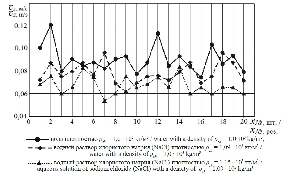 Пределы варьирования скорости ʋz в опытах при погружении зерен в водный раствор хлористого натрия (NaCl) плотностью ρzh = 1,09 ∙ 103 кг/м3 составляют 0,061–0,096 м/с. Среднее арифметическое значение скорости зерновок при данной плотности равно 0,078 м/с.