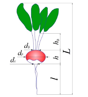 Fig. 5. The scheme for determining the basic dimensional characteristics of radish: L – total length of plant, mm; l – length of radicle, mm; hb – stem length from root to tops leaves, mm; h – height of the root, mm; dp1 – diameter of the root, mm;
