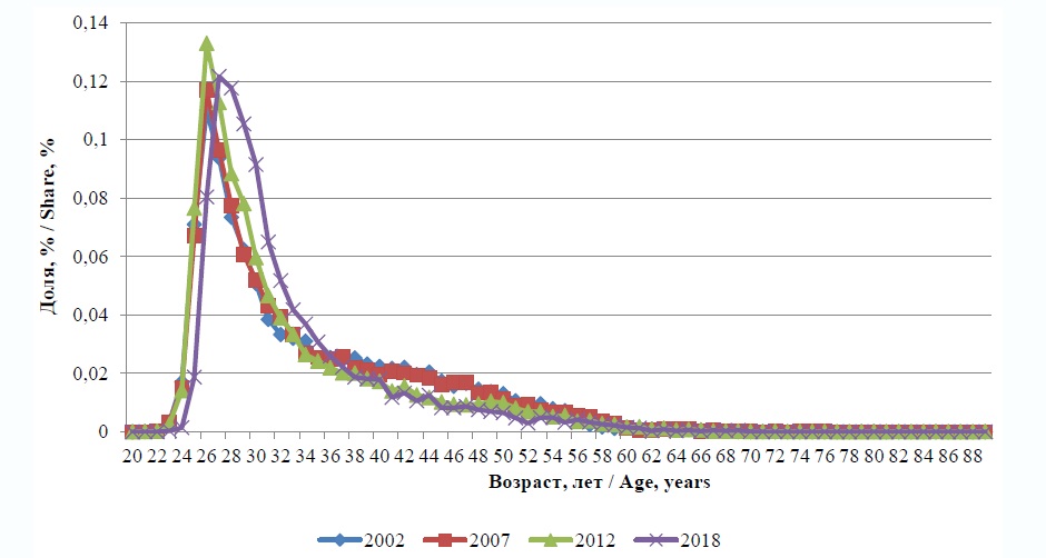 Fig. 4. Percentage of persons awarded degree of Candidate of Sciences by age in 2002, 2007, 2012 and 2018