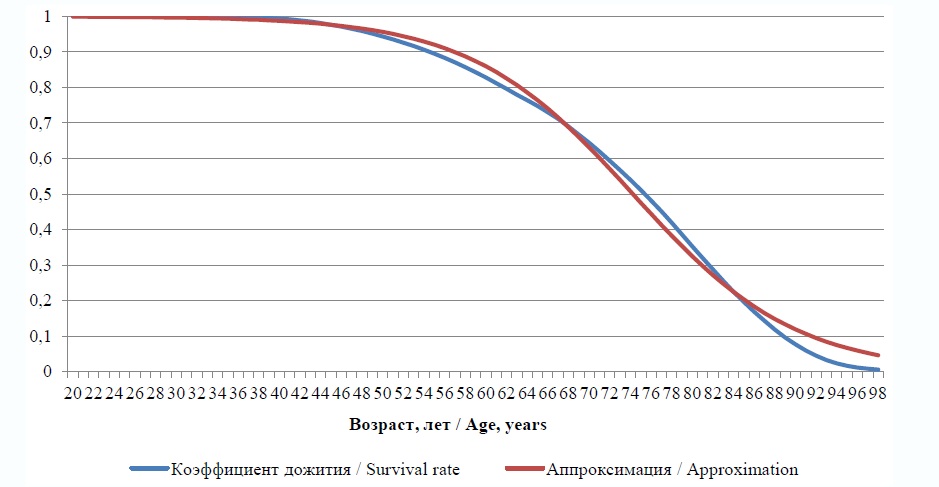 При аппроксимации мультипликативного коэффициента дожития γt(n) логистической функцией (3) значения коэффициента x0 = 74, значение коэффициента τ = 7,87. С учетом этого аналитическое выражение для мультипликативного коэффициента дожития γ(n) имеет вид: