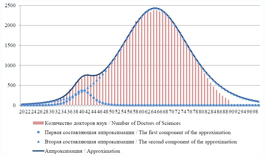 Обсуждение и заключение. Предложенные модели показали свою адекватность. Были получены оценки численности кандидатов наук в возрастных категориях 20–80 лет – 468 тыс. человек; докторов наук в возрастных категориях 30–90 лет –72 тыс. человек. Построенные аппроксимирующие функции позволяют получить число кандидатов и докторов наук в любом возрастном диапазоне. Поскольку система кадров высшей научной квалификации достаточно инертная, то полученная возрастная структура кадров высшей научной квалификации сохранит свой характер еще на протяжении как минимум 10 лет. Полученные оценки численности лиц с учеными степенями позволяют охарактеризовать кадровый потенциал для принятия решений в сфере управления высокотехнологичными секторами экономики.