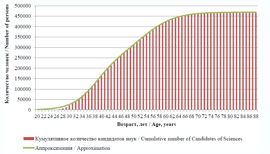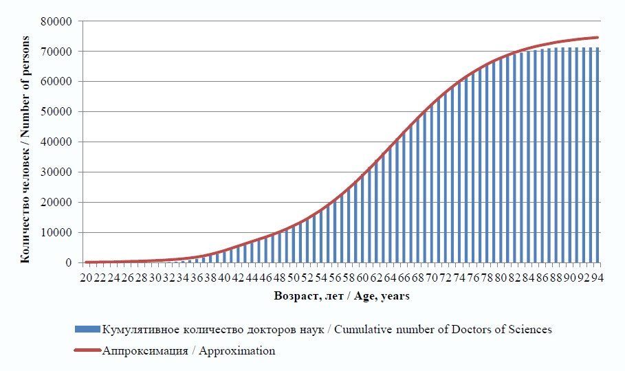 Таким образом, соотношения (5) – (6) позволяют рассчитать распределение общего числа кандидатов и докторов наук по возрастам в диапазоне от 20 до 100 лет, а соотношения (7) – (8) – кумулятивное число кандидатов и докторов наук в возрасте от 20 лет до заданного возраста.