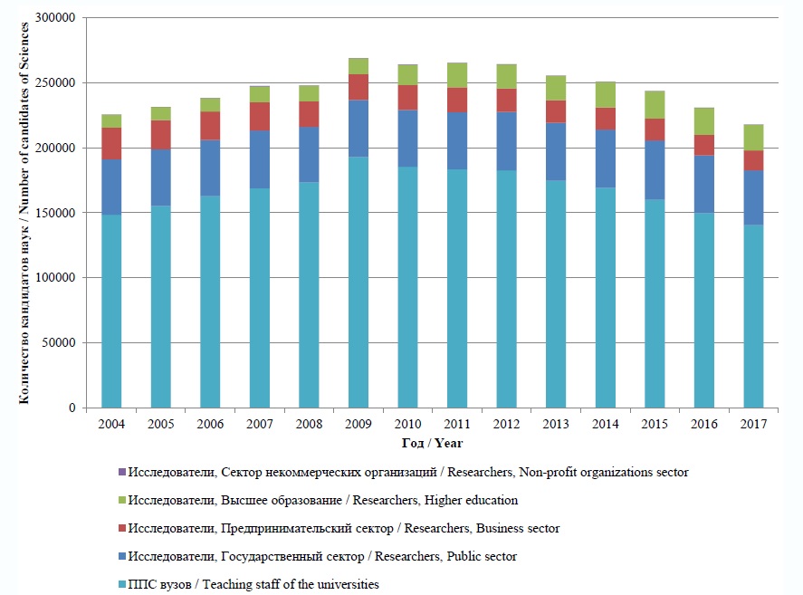 По результатам переписи населения в 2010 году 596 тыс. человек являются кандидатами наук. На 2017 год по данным статистики количество исследователей со степенью кандидата наук в разных секторах экономики, включая НИИ и вузы, составило 77 тыс. человек17 , количество кандидатов наук в числе ППС вузов составило 140,5 тыс. человек18. На рисунке 11 показана отраслевая структура распределения кандидатов наук в динамике с 2004–2017 гг. Суммарное количество кандидатов наук в числе исследователей и ППС вузов составило в 2017 году около 218 тыс. человек.