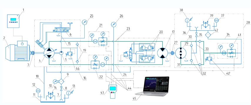 Стенд содержит частотный преобразователь 1, соединенный с электродвигателем 2, приводной вал, который муфтой 3 соединен с валом испытуемого гидронасоса 4 насосом подпитки 5 и сервораспределителем 6, линию всасывания 7 с вентилем 8, фильтром 9 со встроенным вакуумметром 10. Линия всасывания 7 соединяет гидробак 11 с входом насоса подпитки 5. Гидробак 11 оснащен указателем уровня рабочей жидкости 12, электронным термометром 13 и водяным охладителем 14. Линия управления 15 соединяет выход насоса подпитки 5 с сервораспределителем 6. Линия дренажа 16 связывает дренажные полости испытуемых гидронасоса 4 и гидромотора 17. Сливная линия 18 соединяет сливную полость гидронасоса 4 с гидробаком 11. Обратные 19, предохранительные 20 клапаны и реверсивные дроссели-расходомеры 21 и 22 установлены в линиях нагнетания 23 и 24. Линии нагнетания 23 и 24 соединяют гидронасос 4 с гидромотором 17. Манометры давления 25, 26 установлены в линиях управления 15 и дренажа 16. Выходной вал испытуемого гидромотора 17 соединен муфтой 27 с валом гидравлического нагружающего устройства 28, который обеспечивает заданный тормозной момент.