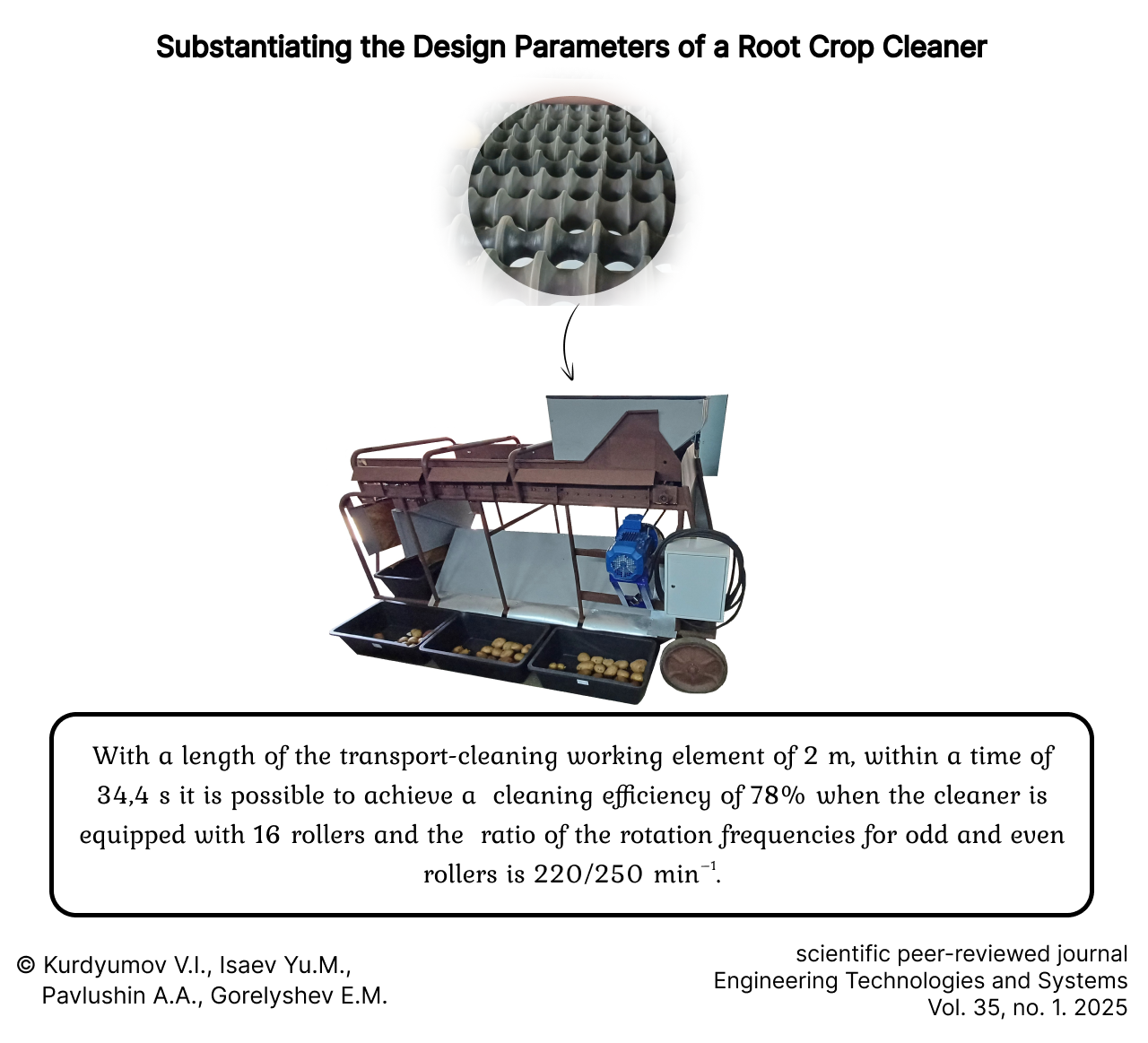 Discussion and Conclusion. The studies of the root crop cleaner conducted in laboratory conditions have confirmed the results of theoretical studies and showed that with a length of the transport-cleaning working element of 2 m within a time of 34,4 s it is possible to achieve an efficient cleaning of 78% when the cleaner is equipped with 16 rollers and the ratio of the rotation frequencies for odd and even rollers is 220/250 min–1. The study results are useful for creating and modernizing technical means for post-harvest processing of root crops, conducting further studies on technological improvement of similar means of mechanization of agricultural processes, and for using in the educational process to train technical special ists.