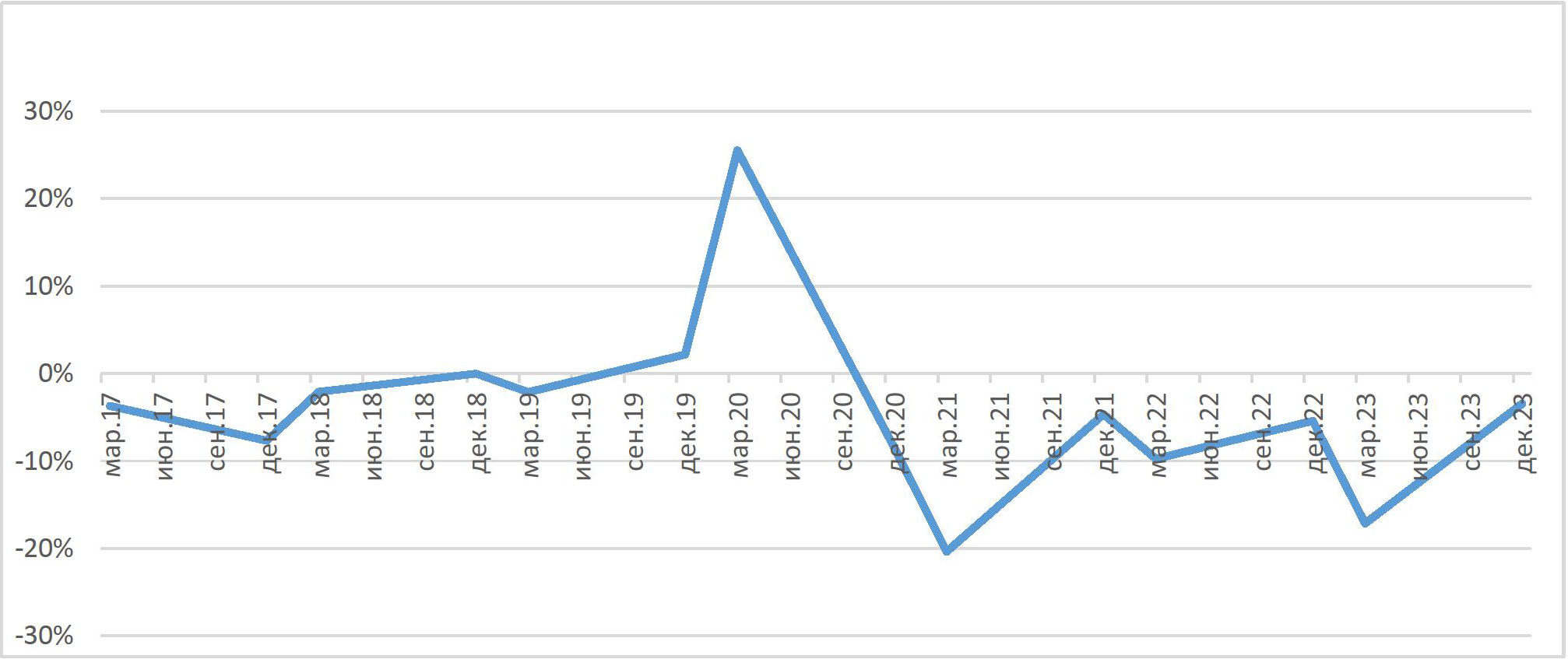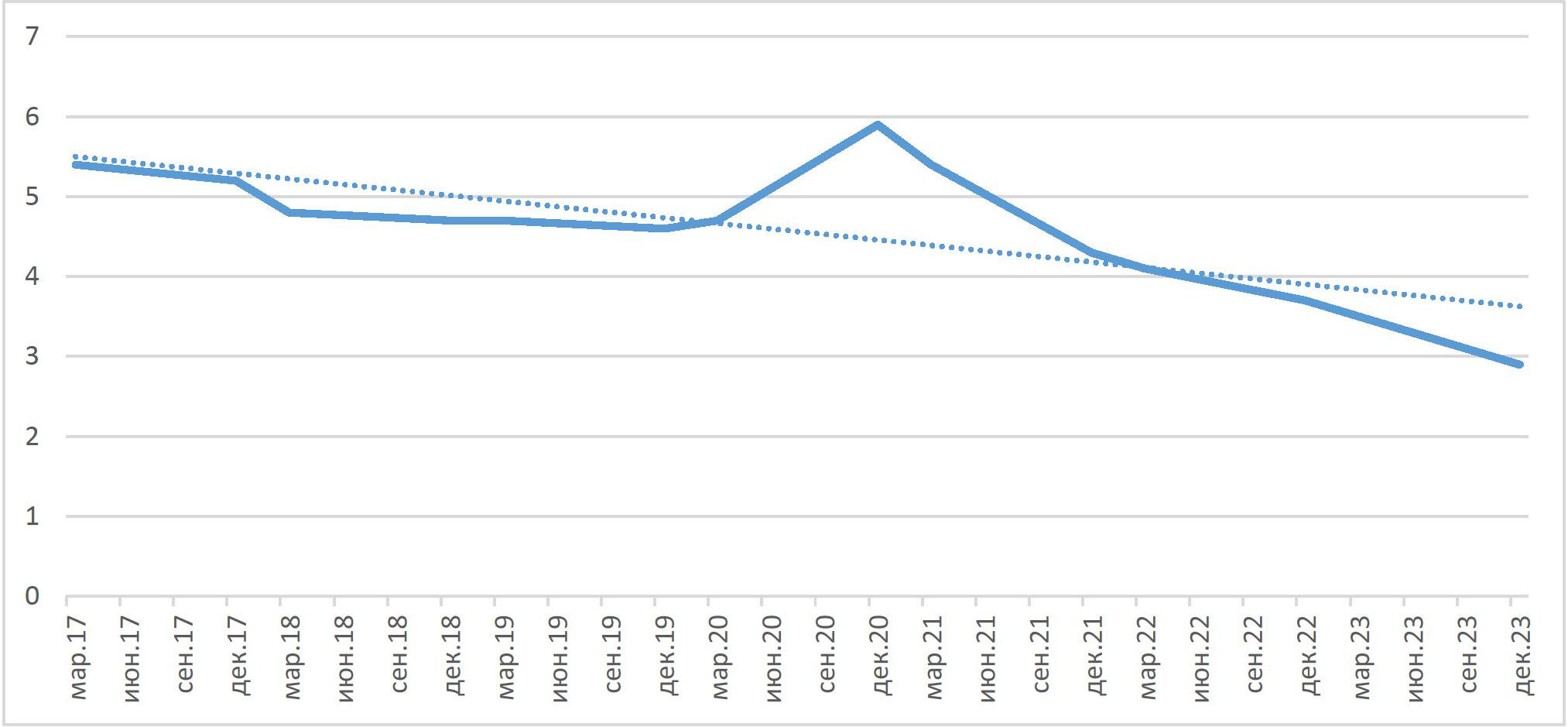 По информации Росстата, в феврале 2024 г. уровень безработицы достиг рекордного значения – 2,8 % (2,9 % − в январе 2024 г.). Для более наглядного результата был построен график изменения уровня безработицы. В качестве точек на график использовались статистические данные за март (начало года) и декабрь (конец года). Данный способ предполагает возможность оценить общий тренд, который заключается в практически линейном понижении показателя безработицы. Из общего тренда выделяется период проведения карантинных мер COVID-19. На графике (рис. 1) видно, что через полтора года после введения соответствующих мер уровень безработицы вернулся к тренду сокращения.