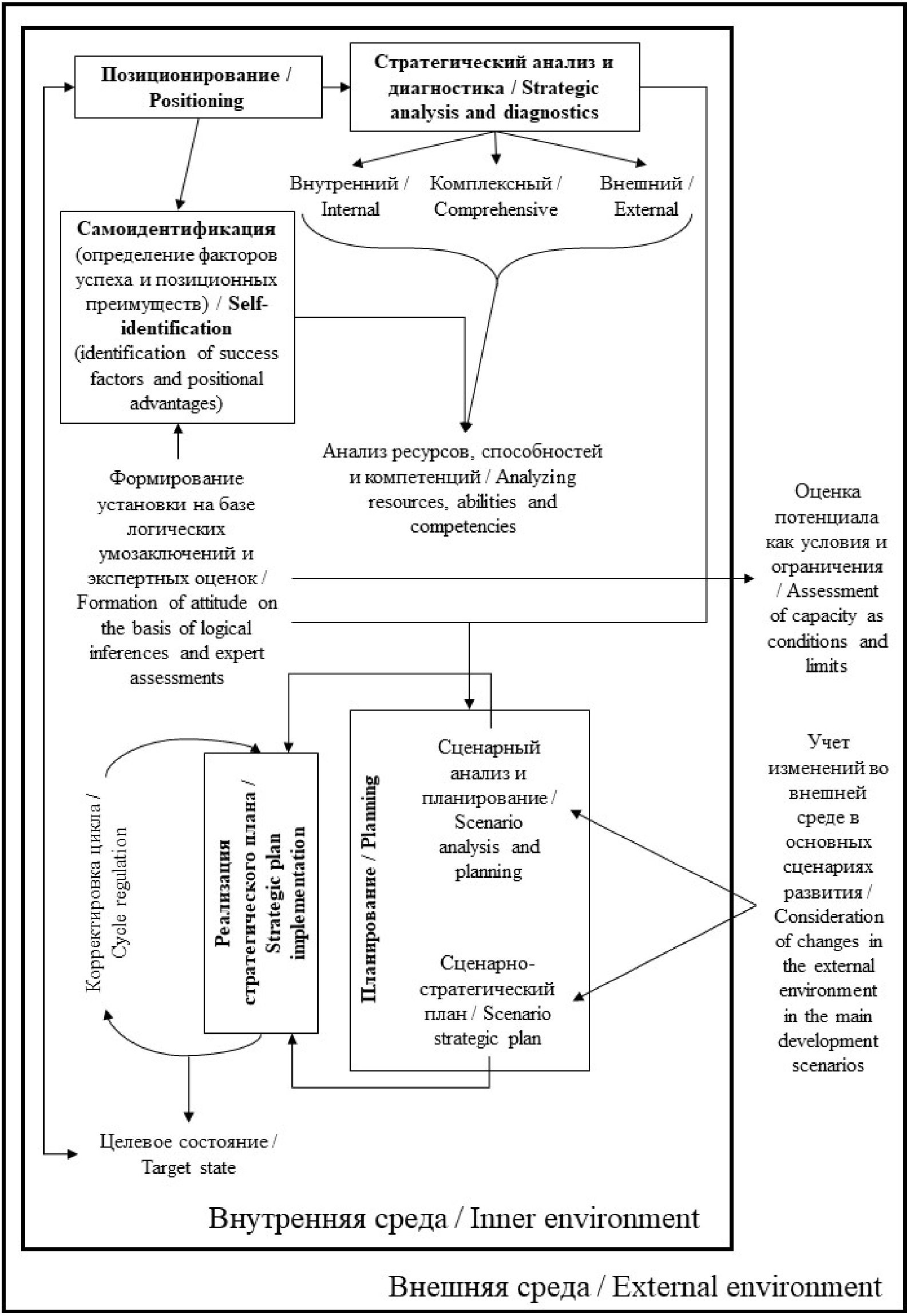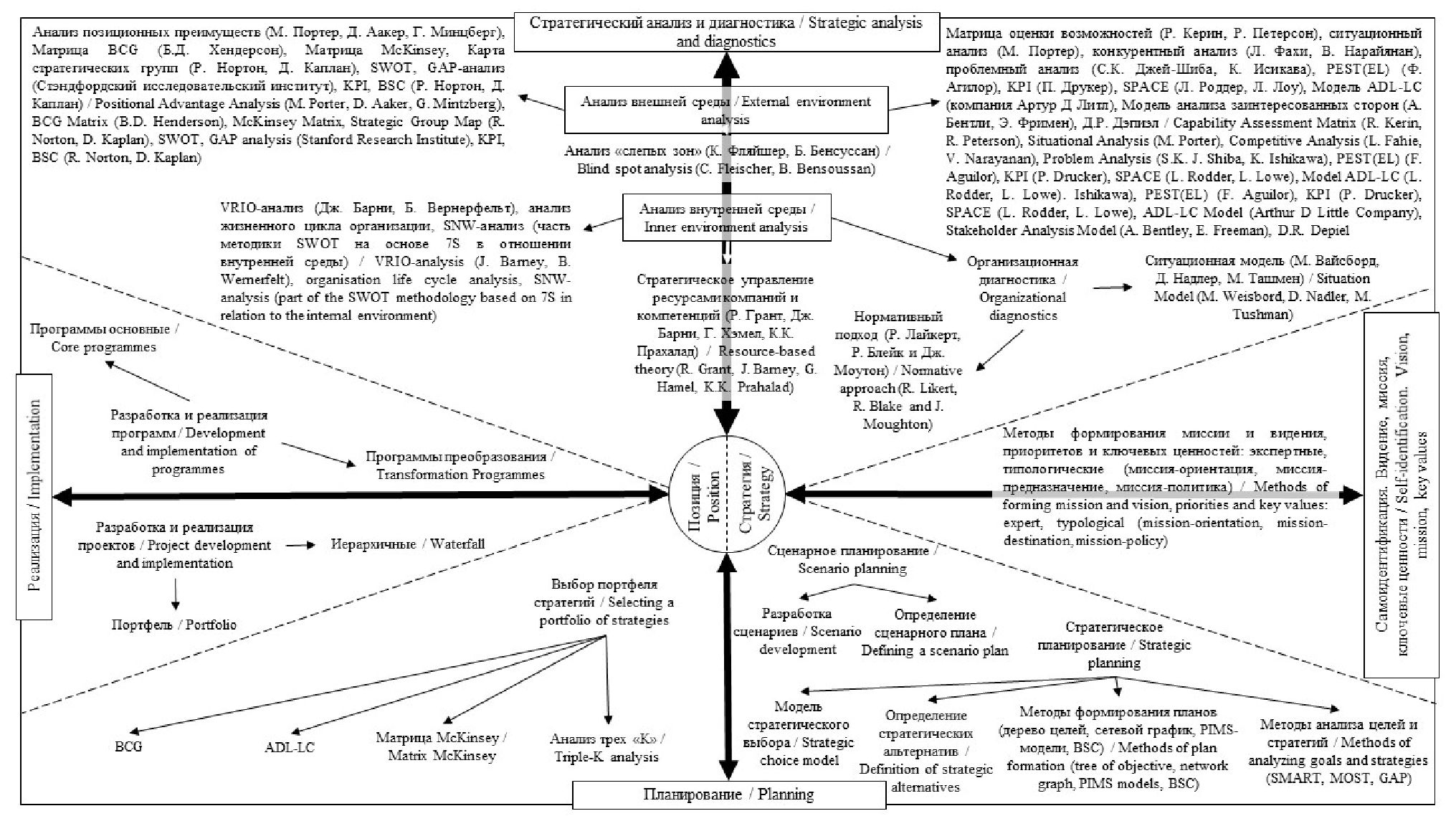 Авторы предложили систематизацию методов стратегического управления с учетом его природы. Внутренний контур охватывает два основных аспекта стратегического управления (позицию и стратегию), которые позволяют понять этот процесс в статике и динамике. Внешний контур представляет собой структурированную систематизацию методов по этапам стратегического процесса. Такой подход помогает рассмотреть различные способы выполнения каждого этапа, выбор которых зависит от ситуации и особенностей управляемого объекта.