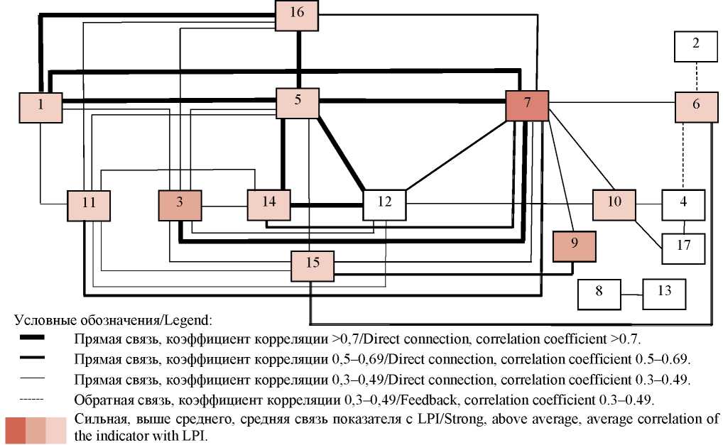 С применением многофакторного корреляционного анализа была установлена теснота взаимосвязи факторов и результирующего показателя эффективности ТЛС стран. Было выявлено 11 показателей, имеющих среднюю и высокую степень взаимосвязи с LPI. Кроме того, были обнаружены цепочки неявных взаимосвязей показателей. Так, например, уровень инновационности ТЛК имеет взаимосвязь высокой и средней степени с 11 показателями. В результате анализа было определено, что эффективность ТЛС в большей степени связана с такими факторами, как инновационность, структура участников и зрелость ТЛК. Иными словами, количество ТЛК само по себе не оказывает сильного влияния на эффективность ТЛС: большее значение имеют конкретные характеристики ТЛК, их специализация, инновационный потенциал.