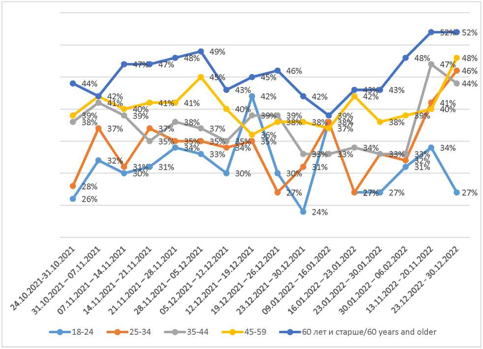 Уровень тревожности ожидаемо повышается с возрастом (рис. 4). Так, если в возрасте 18–24 и 25–34 лет самые низкие показатели тревожности составляют 24 и 26 % соответственно, то уже в группе 35–44 лет уровень тревожности повышается до 33 %, в группе 45–59 лет – до 36 %. Наиболее тревожной группой остаются россияне старше 60 лет: здесь минимальный уровень тревожности составляет 42 %, а максимальный – 52 %, что выше, чем в целом по выборке. В то же время граждане предпенсионного и пенсионного возрастов в своей тревожности достаточно стабильны: их эмоционально-психологическое состояние колеблется, но в меньшей степени, чем у более молодых возрастных когорт. Этот факт позволяет в данном случае говорить о двух типах социальной тревожности – высокой, но стабильной, и нестабильной, но более низкой. Оба типа тревожности, безусловно, несут в себе рискогенный потенциал. В то же время можно предположить, что люди старших возрастов обладают более высокой личностной тревожностью в силу снижения адаптационного потенциала, ухода с рынка труда и потери социальных связей. В свою очередь, перепады уровня тревожности экономически активных возрастных групп вызывает большую настороженность и говорит о том, что их жизненный тонус снижается и именно они оказываются наиболее уязвимыми перед макросоциальными рисками. Ситуация усугубляется тем, что именно эти люди несут ответственность (в своем большинстве) как за нетрудоспособных родителей, так и за детей, что еще больше сказывается на их возможностях адаптации к вызовам постковидной реальности и событиям, которые связанны с началом СВО.