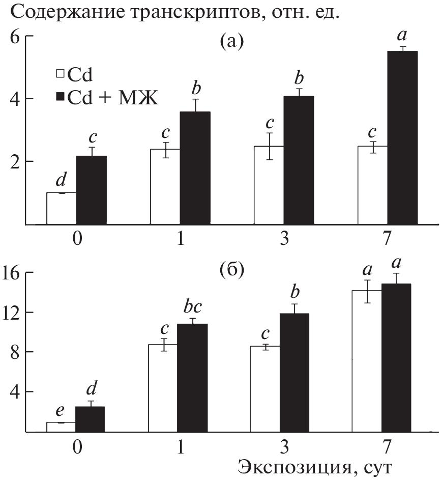 The effect of the phytohormone – methyl jasmonate (MJ) on the expression of the TaGS1 and TaPCS1 genes encoding glutathione synthetase and phytochelatin synthase, respectively, which are key enzymes in the synthesis of glutathione and phytochelatins in wheat (var. Moskovskaya 39), was studied. For the first time, it has been shown, that pretreatment of plants by exogenous MJ (1 μM) leads to an increase in the accumulation of transcripts of the TaGS1 and TaPCS1 genes in leaves without cadmium effect. When cadmium (CdSO4, 100 μM) was added into the nutrient solution, the transcript level of TaGS1 gene increased in plants pretreated by MJ (compared to untreated plants), while the transcript level of TaPCS1 remained unaffected. The pretreatment of plants by MJ leads to a lower accumulation of cadmium in the roots and leaves of wheat. At the same time, MJ had no effect on the linear growth parameters of plants, but had a positive effect on the accumulation of biomass under cadmium. It has been suggested that MJ is involved in plant tolerance to cadmium by increasing the expression of the TaGS1 and TaPCS1 genes and, as a result, enhancing the synthesis of chelating compounds, as well as by reducing the supply of metal ions to plants.