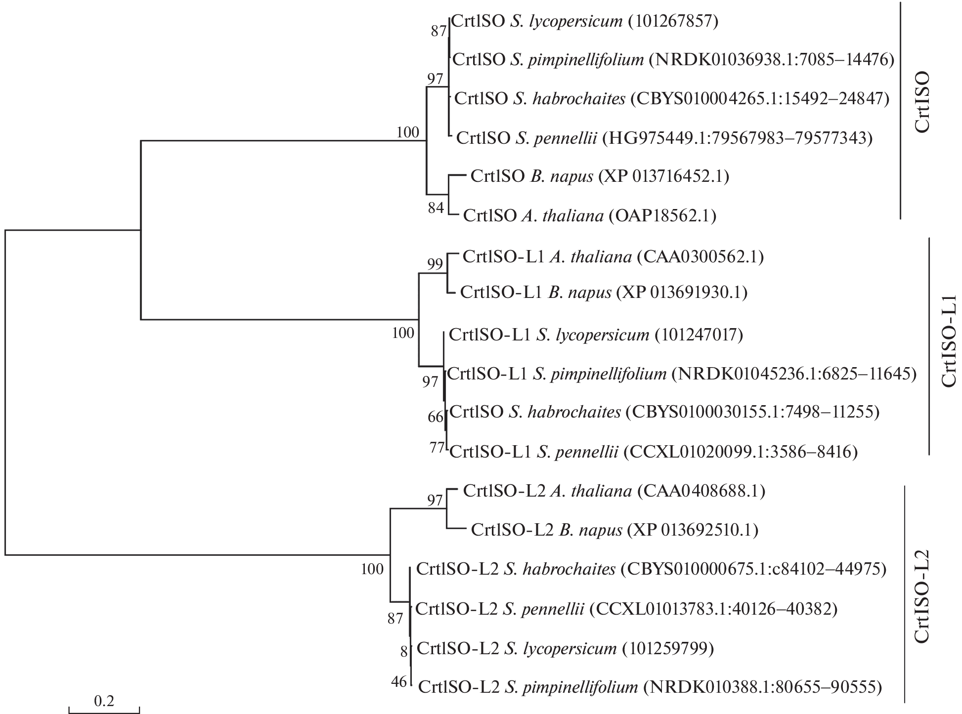 The expression of the genes of carotenoid-cis-trans isomerases CrtISO, CrtISO-L1 and CrtISO-L2 was studied in comparison with the content of carotenoids in tomato species with different ripe fruit colors: green (Solanum habrochaites), yellow (S. cheesmaniae) and red (S. pimpinellifolium and S. lycopersicum). More ancient origin of CrtISO-L2 was shown in relation to CrtISO and CrtISO-L1. A similar content of total carotenoids (leaves) and β-carotene (ripe fruits) was found between the samples. Unlike fruits of S. habrochaites and S. cheesmaniae, red fruits accumulated lycopene and 20-30 times more total carotenoids. The highest level of transcripts both in leaves and in ripe fruits was detected for CrtISO. The CrtISO-L1 and CrtISO-L2 were transcribed high in leaves and low in fruits, except for the high expression of CrtISO-L2 in S. lycopersicum fruits. No relationship was observed between the content of carotenoids and the level of gene expression in the fruit. In the leaves, a positive correlation between the amount of carotenoids and the levels of CrtISO-L1 and CrtISO-L2 transcripts was found.