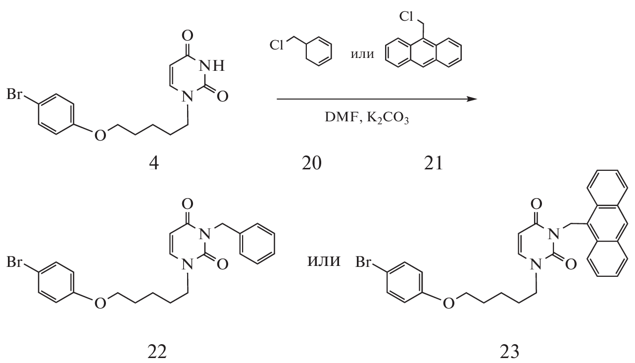 A new series of 1-[ω-(bromophenoxy) has been synthesizedalkyl]-uracil derivatives containing naphthalene-1-yl-, naphthalene-2-yl-, 1-brominaphthalene-2-ilmethyl, benzyl and anthracene-9-ilmethyl fragments in position 3 of uracil. Antiviral properties of synthesized compounds against human cytomegalovirus were studied. It was found that the compound, which has a bridge consisting of five methylene groups, has high anti-cytomegalovirus activity in vitro. uracil