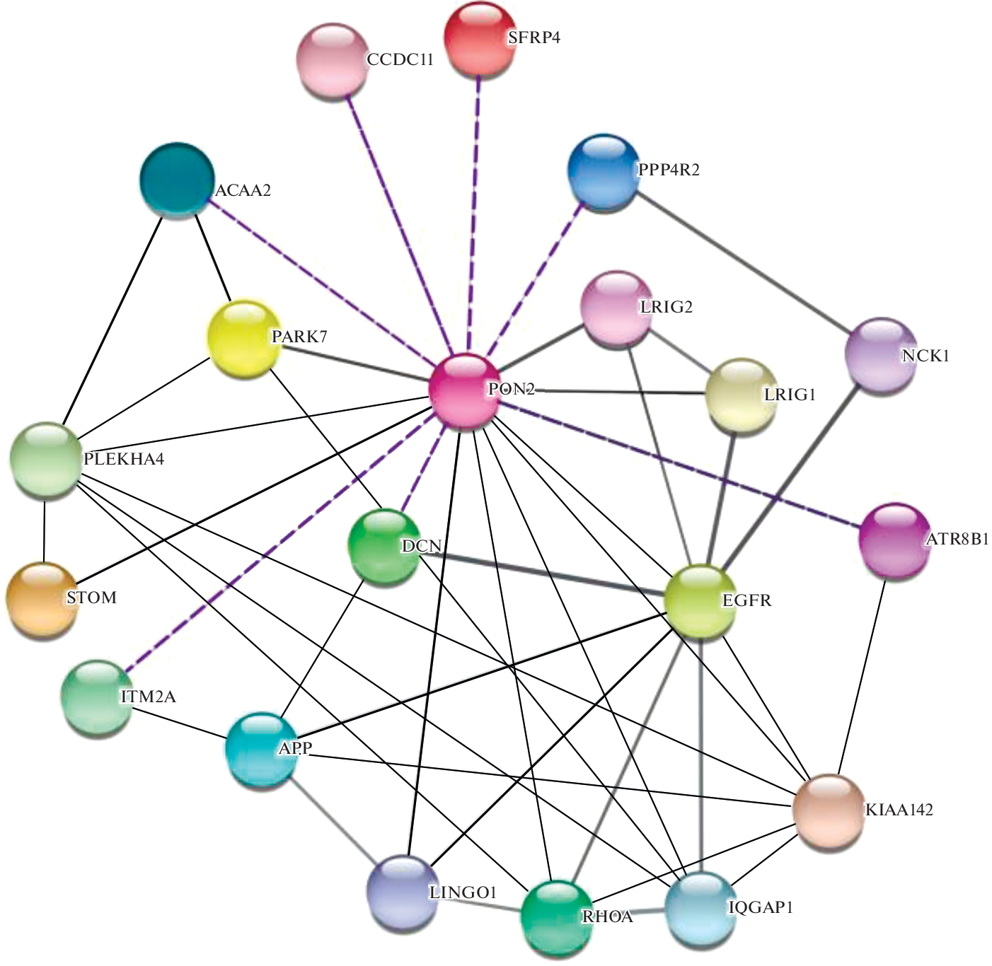 The interactome of paraoxonase-2 encoded by the PON2 gene was investigated. A cDNA library was screened using a yeast two-hybrid system to search for new proteins interacting with human PON2. Analysis of the identified candidates, along with previously published data on interactors obtained by other methods, indicates the presence of a significant number of indirect interactions between PON2 and EGFR and, consequently, possible regulation of tumor growth with mutant EGFR involving PON2.