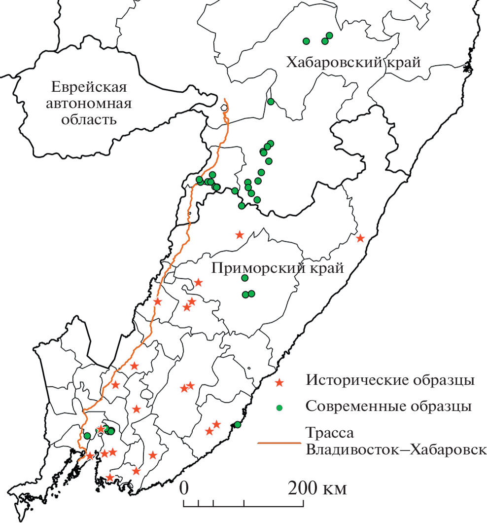 Проанализирован полиморфизм 9 микросателлитных локусов сихотэ-алинской популяции тигра в современный и недавний исторический период с использованием крови, экскрементов и музейных костных образцов. Тесты на прохождение популяцией периода низкой численности при анализе избытка гетерозигот и низкое значение коэффициента Гарза-Вильямсона указывают на высокую вероятность таких событий в недавнем и в историческом прошлом. Средний эффективный размер популяции Ne для современной выборки составил 34.4 (95% интервал 17-106.8). Полученные данные представляют большой интерес для сохранения и восстановления крупных видов кошачьих, находящихся под угрозой исчезновения.