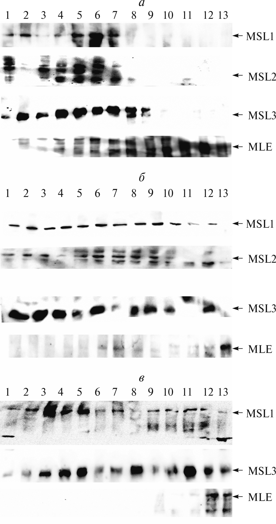 Рис. 1. Выявление компонентов КДК в сахарозном градиенте 10–40%. (а) Лизат без обработки нуклеазой, с VNC. (б) Лизат, обработанный РНКазой А. (в) Лизат, обработанный РНКазой III. Иммуноблот-а- нализ проведен с антителами, специфично узнаю- щими белки MSL1, MSL2, MSL3, MLE. Цифрами отмечены номера собранных фракций от 1 до 13 (от «тяжелой» к «легкой»).