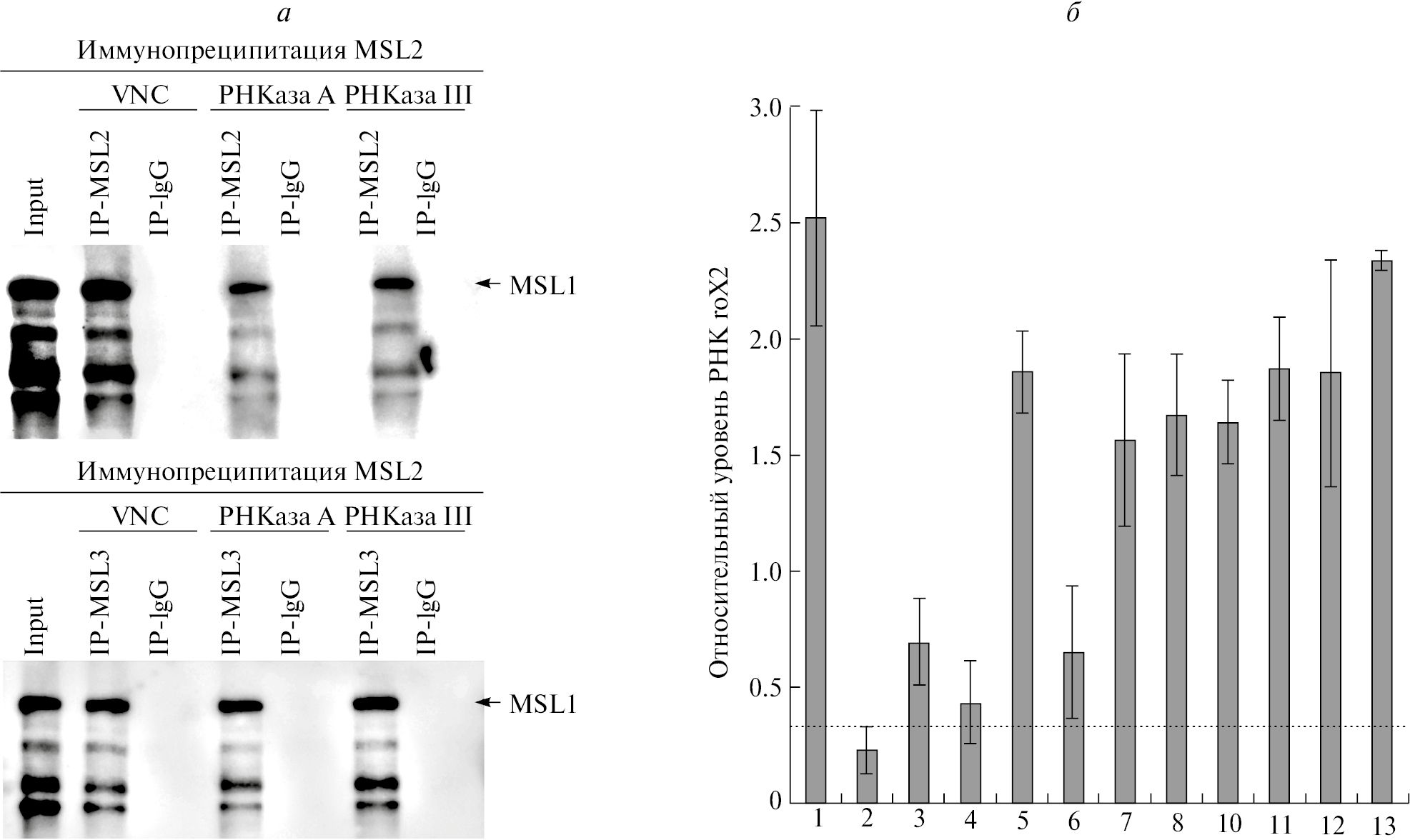 Рис. 2. (а) Результаты иммунопреципитации ядерных экстрактов, выделенных из культуры клеток S2, с антителами, специфично узнающими белки MSL2 и MSL3, или с иммуноглобулинами G кролика (отрицательный контроль). Экстракты проходили 3 вида обработки: 1) без нуклеаз, обработаны неспецифичным ингибитором РНКаз VNC, 2) с добавлением РНКазы А, 3) с добавлением РНКазы III. Иммунопреципитаты анализировались при помощи иммуноблот-анализа на присутствие белка MSL1 в образцах. ‘input’ – исходный экстракт; IP-MSL2 – образец после иммунопреципитации антителами, специфично узнающими белок MSL2; IP-MSL3 – образец после иммунопреципитации антителами, специфично узнающими белок MSL3; IP-IgG – образец после иммунопреципитации иммуноглобулинами G кролика. (б) Выявление РНК roX2 во фракциях, полученных после аналитического ультрацентрифугирования в сахарозном градиенте 10-40% ядерного экстракта из культуры клеток S2. Пунктирной линией отмечен уровень фона. Стандартные отклонения построены по результатам четырех измерений.