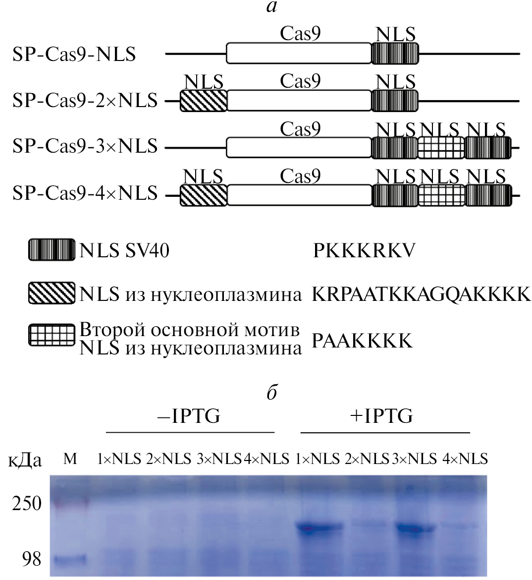 Рис. 1. (а) Схемы плазмидных конструкций для экспрессии Cas9 с различным числом NLS в клетках E.coli. Показаны аминокислотные последовательности NLS вируса SV40, NLS из белка нуклеоплазмина и последовательность второго оснóвного мотива из NLS нуклеоплазмина (PAAKKKK) [20]. (б) Электрофореграмма лизатов клеток E.coli BL21 (DE3), трансформированных одной из четырех конструкций для продукции Cas9, до и после индукции экспрессии с помощью IPTG. Белки разделяли в 7.5 % акриламидном геле и окрашивали красителем Кумасси R‑250. М – маркеры молекулярного веса белков.